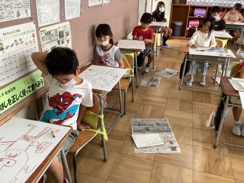 全校児童が、画用紙に向かって真剣な表情をしています。今日は「絵をかく会」です。学年のテーマに合わせて取り組んでいます。