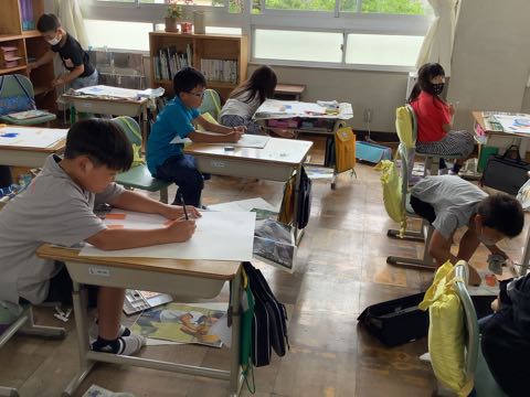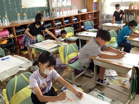 5年生は、風景画。吉田小学校の校舎や、遊具を描いている子が多いです。