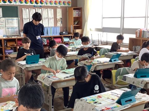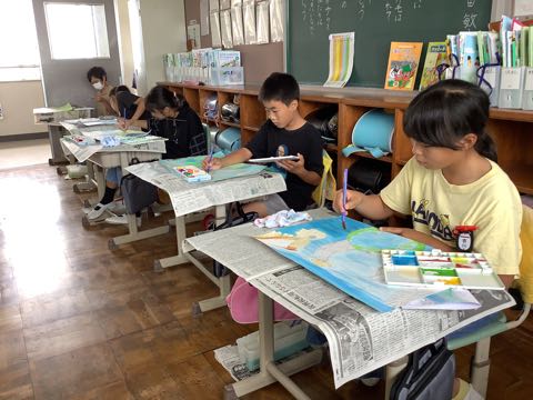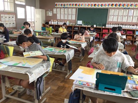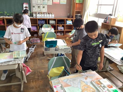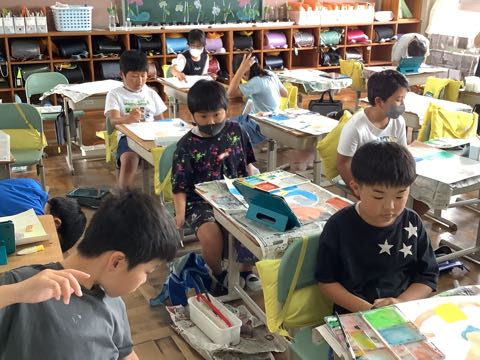 4年生は、友達。絵の具を薄くして、何度も色を重ねて塗っています。