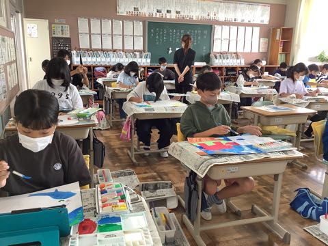 6年生は、空想画。事前に学習したいろいろな技法を使いながら、色を塗っています。