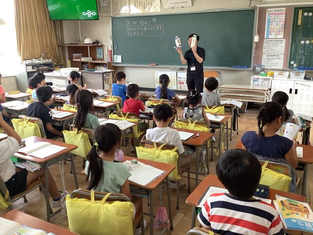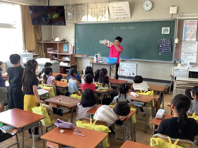 2年生は、算数でかさの勉強をしました。真剣に話を聞いています。