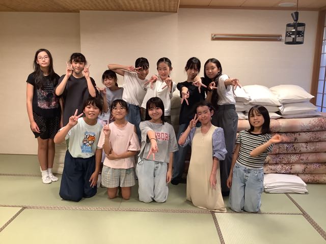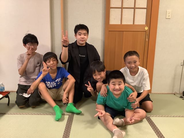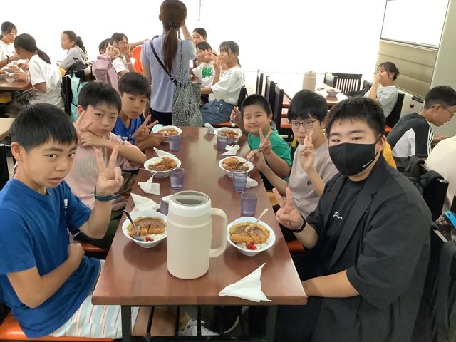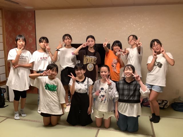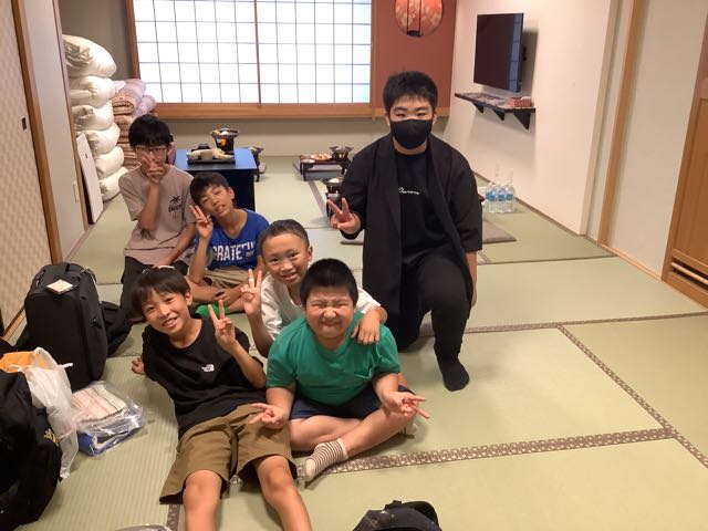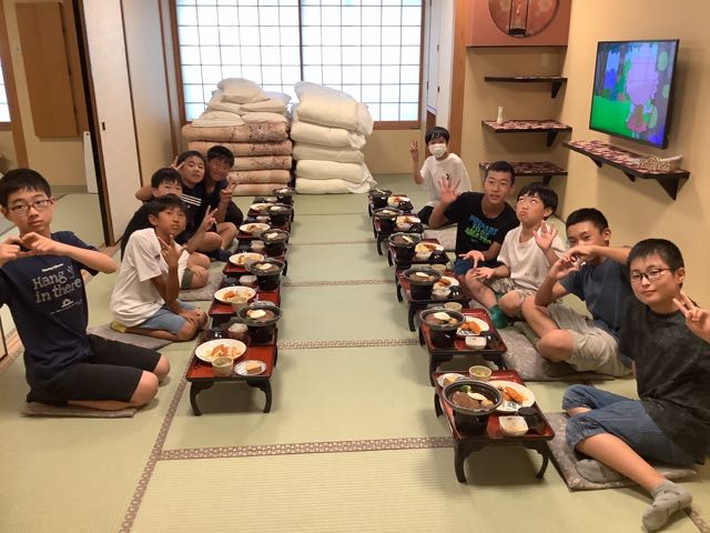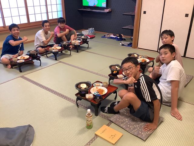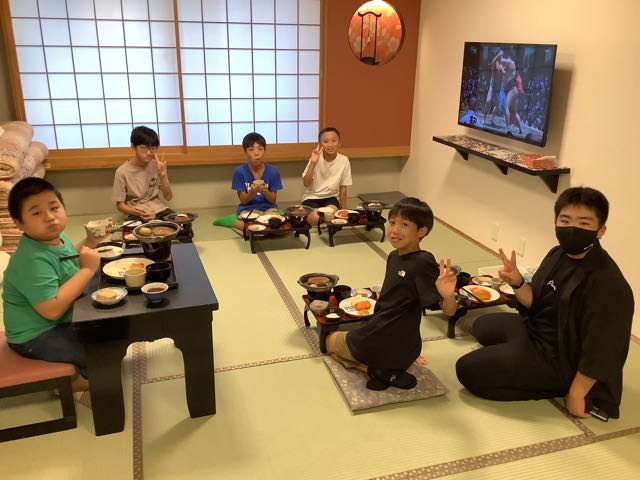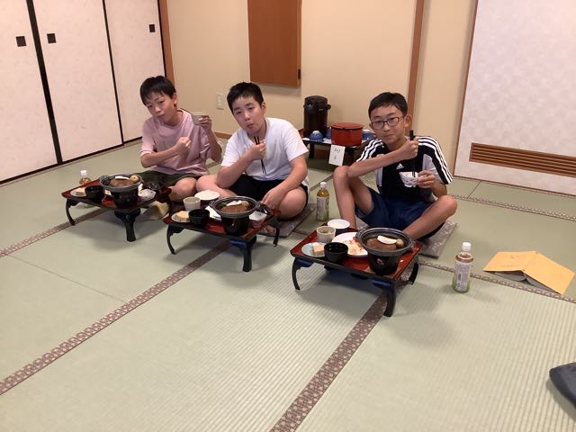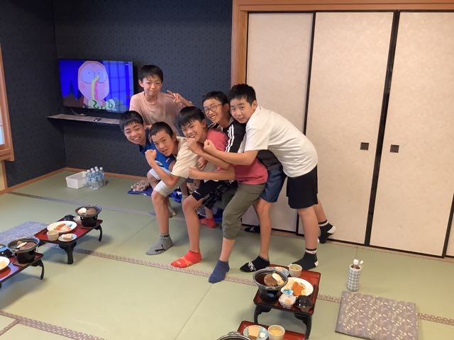 少し早く旅館に到着しました。みんなお腹ぺこぺこです。お部屋でゆっくり夕食を楽しんでいます。