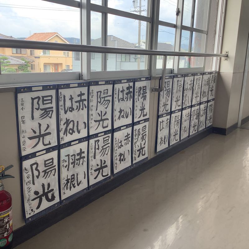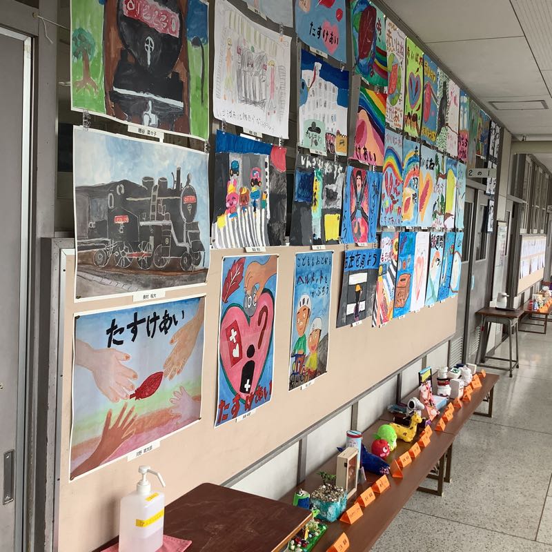 子どもたちが夏休みの課題で取り組んだ自由研究やポスター、工作などを廊下に掲示しました。