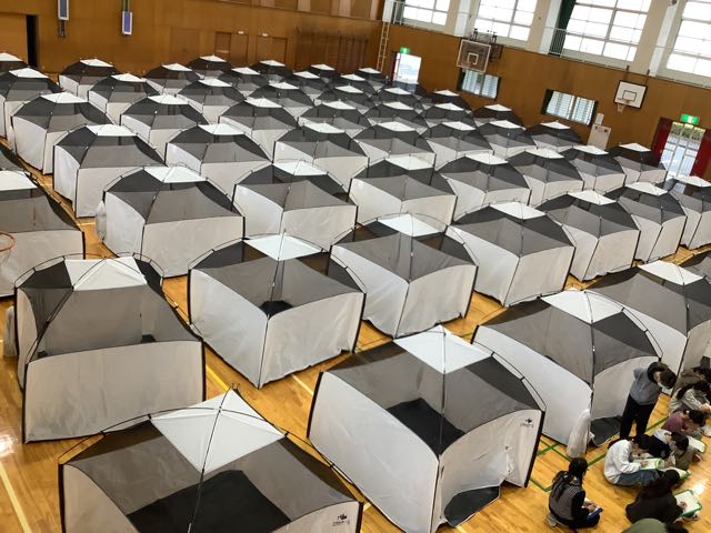 今日は、居心地のよい避難所にするために、テントを60基立てて、避難所運営の模擬体験をしました。