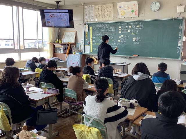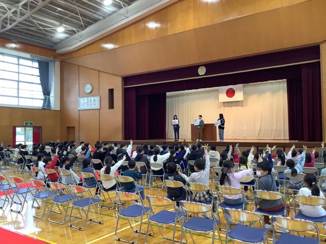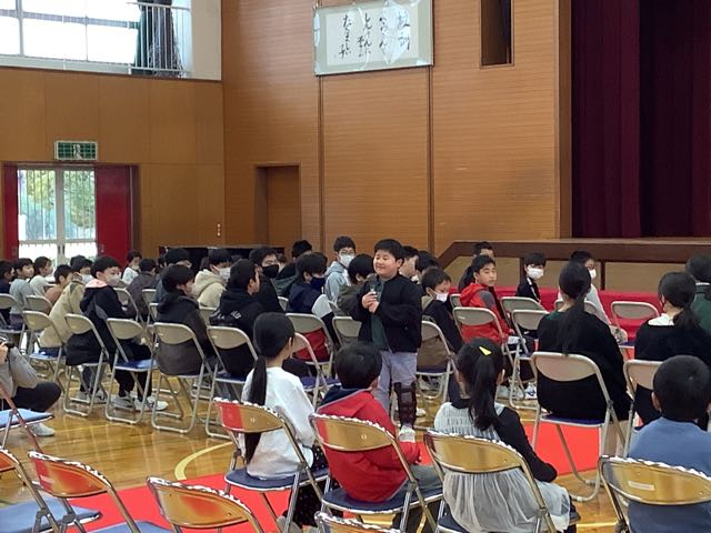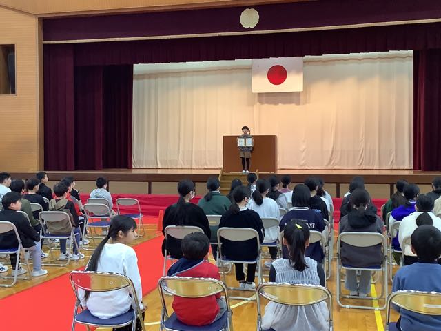 今日の全校朝会では、もうすぐ卒業する6年生が「吉小の宝」という話をしました。