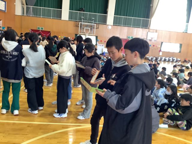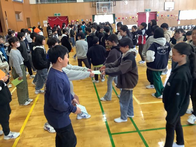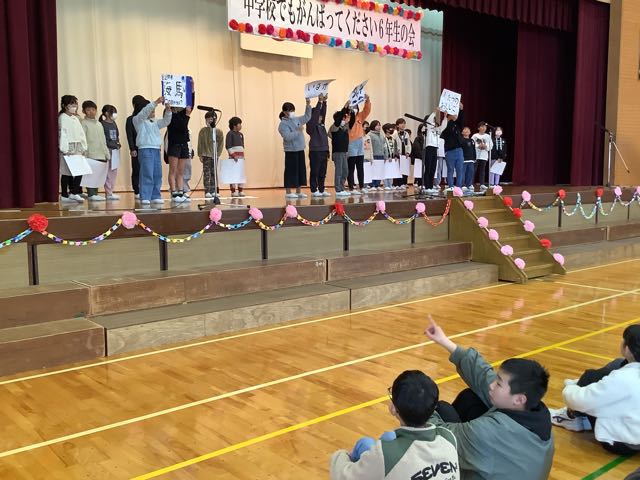 「6年生のみなさん、大好きです。」「中学校に行っても忘れないでね。」「わたしたちはがんばるから、中学校でがんばってください!」たくさんの感謝と応援メッセージを贈りました。6年生のみなさんはとてもうれしそうでした。