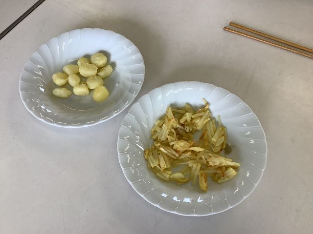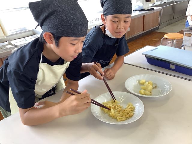 6年生が育て、収穫したじゃがいもを料理しました。家庭科で習ったことを思い出しながら、粉ふきいもと細切り炒めに挑戦しました。