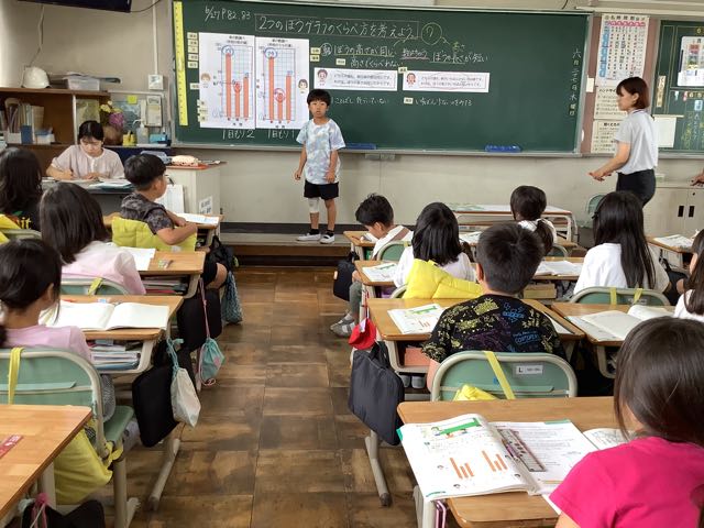 黒板に貼られたグラフを使って、自分の考えをみんなに伝えていきます。