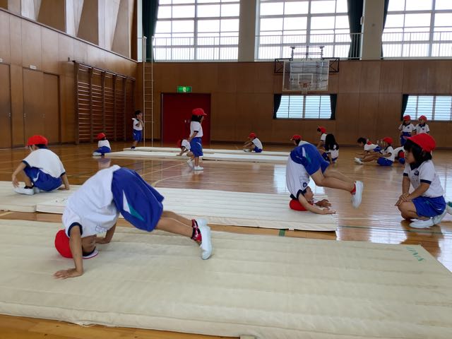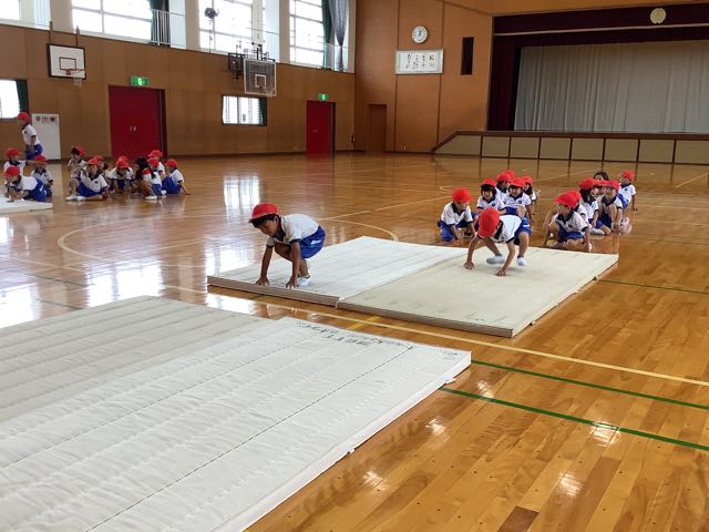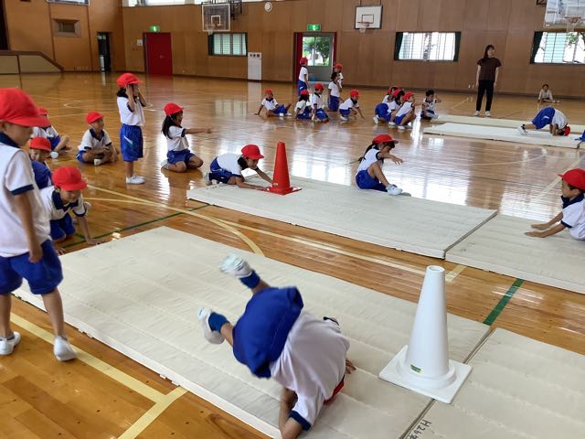 カエルとび、前転など軽やかに跳んだり、回ったりできています。