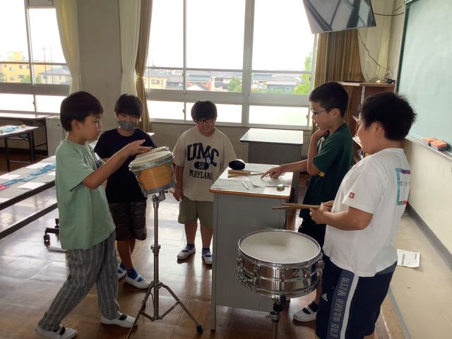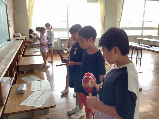 グループでアンサンブルをしようと、楽器を選び、リズムを一生懸命考えていました。「これはどうかな。」「他に楽器に代えてやってみよう。」「ぼくのリズム、合っているか聴いててね。」とても楽しそうです。どんなアンサンブルが出来上がるのか楽しみです。