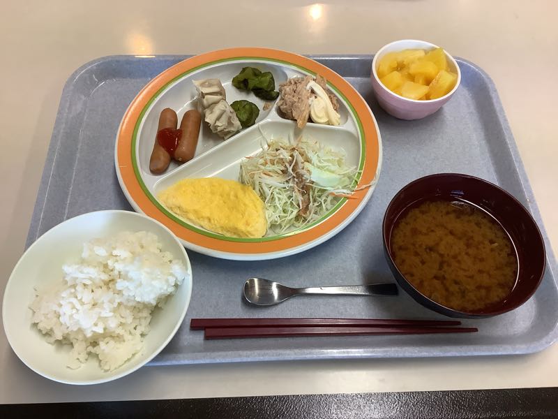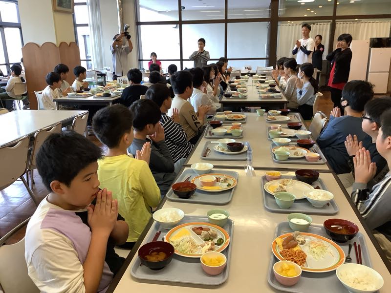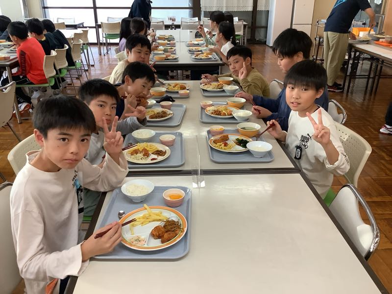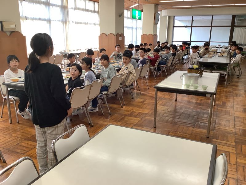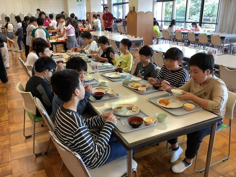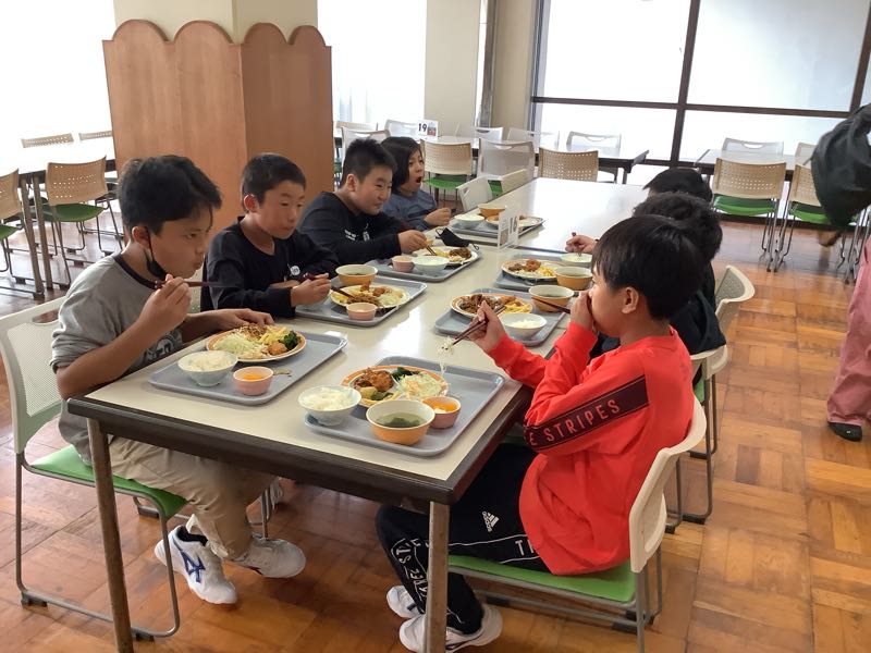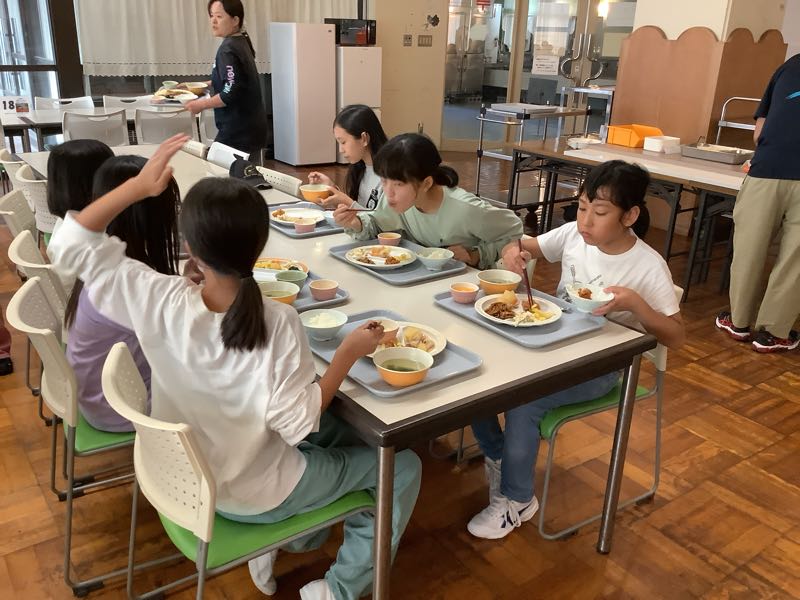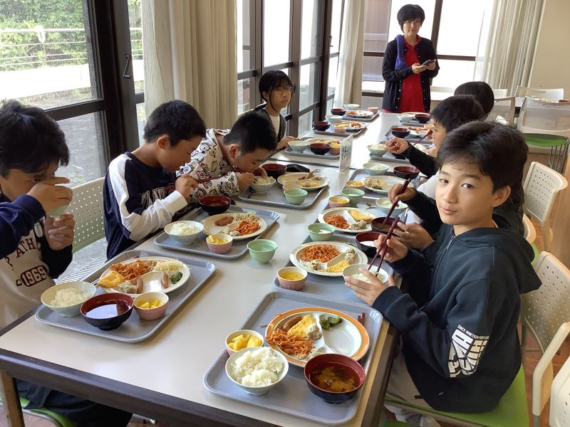 朝ごはんしっかり食べて午前中のウォークラリーに備えます。バランスよい食事を心がけている児童が多いです。