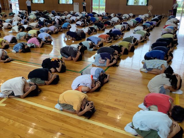 防災の日ということで、防災担当の先生の話、そしてシェイクアウトの練習をしました。