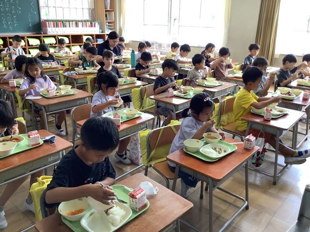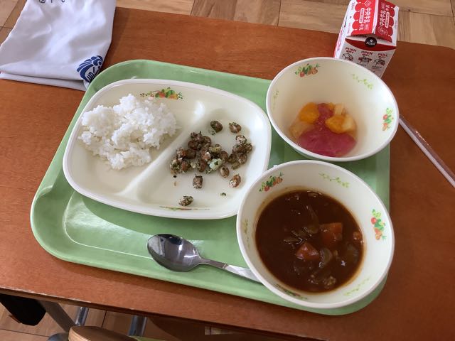今日から給食スタートです。登校時、「今日のメニューは何かな?」「フルーツポンチ!嬉しい!」という声が、聞こえてきました。今日のメニューは、ご飯、牛乳、ナスのハヤシ、青のりポテトビーンズ、フルーツポンチでした。