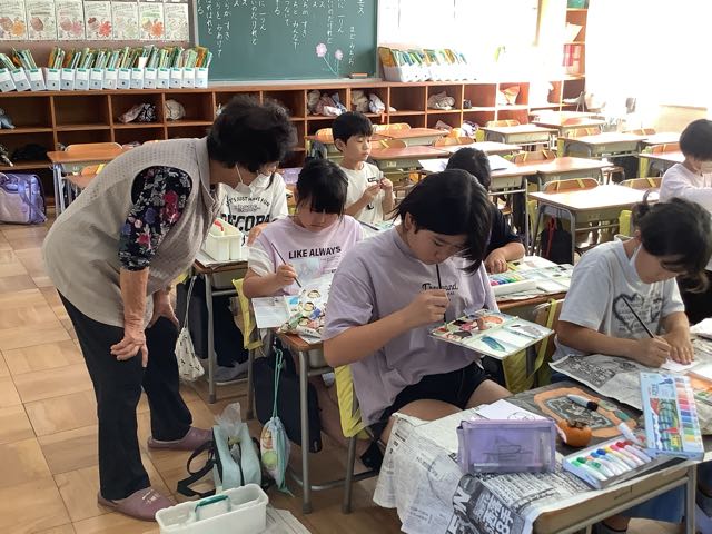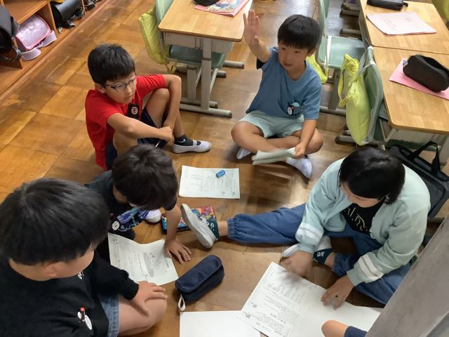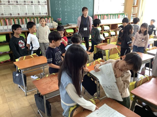 4年生の教室では、セリフの練習や動作の工夫など、グループに分かれて活動していました。みんなでアイデアを出し合う姿がいいです。