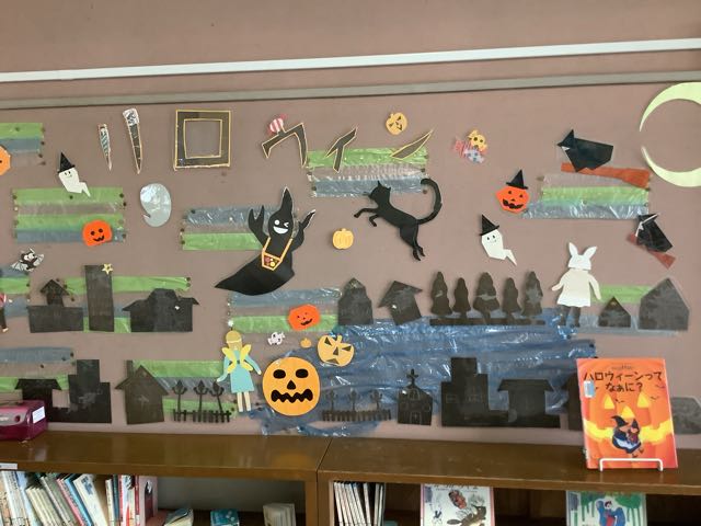 絵本の部屋はハロウィンの掲示で心がわくわくします。