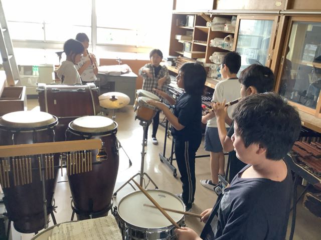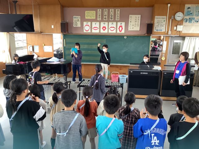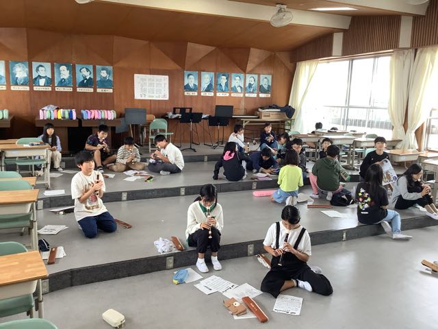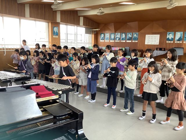 音楽室では、3年生がリコーダーや鉄琴、木琴で合奏をしていました。