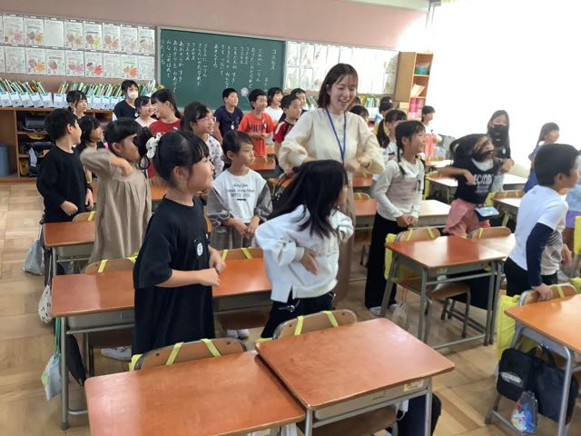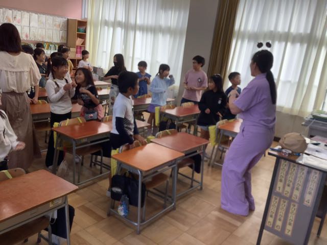 元気いっぱいのアリス先生をお手本にして、みんなでガイコツのダンス!2年生の子どもたちが英語の歌に合わせて楽しそうに踊っていました。