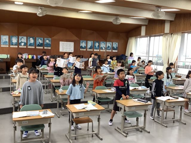 音楽室では2年生が「手のひらを太陽に」を元気いっぱいに歌っていました。子どもたちの歌声は、人を元気にする力があります。