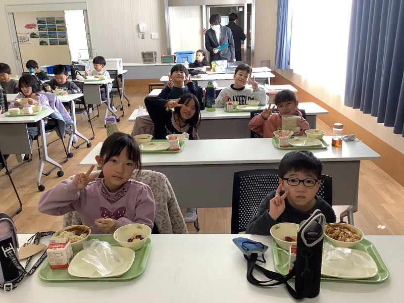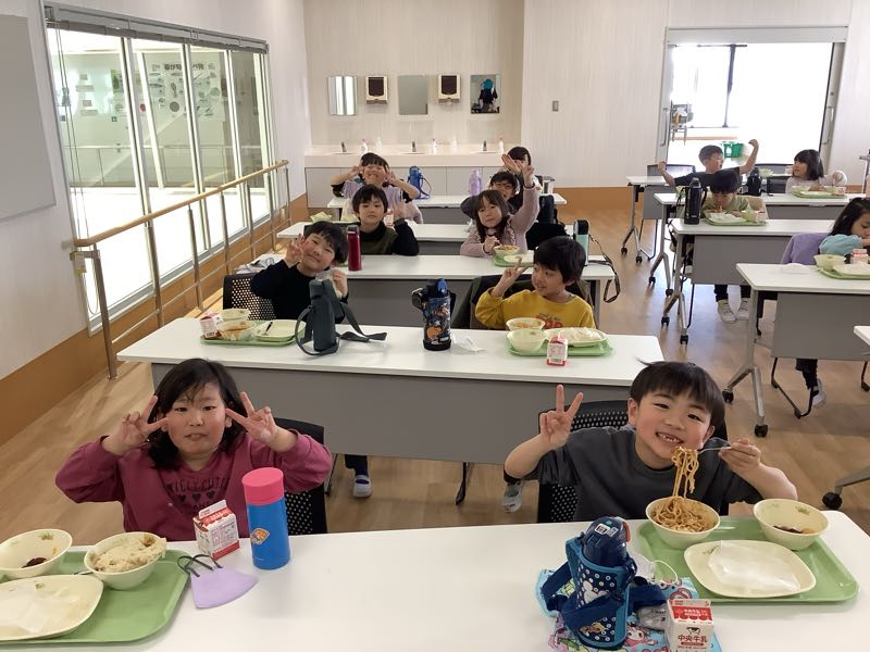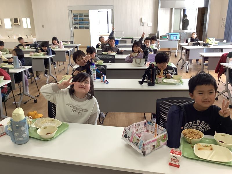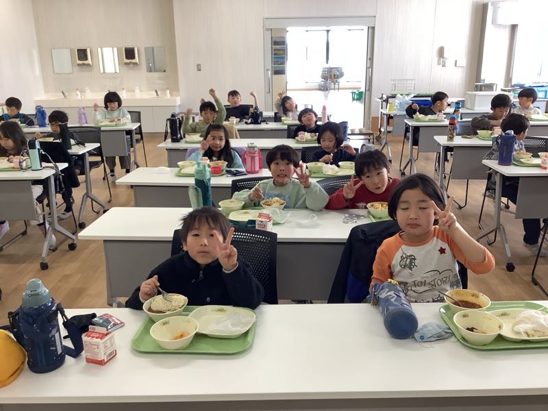 そのあとは、お待ちかねの給食!給食センターで食べる給食はいつもよりも美味しかったようで、おかわりもして、みんなもりもり食べていました。