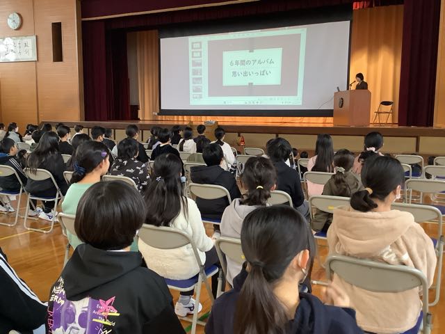 校長先生のお話は、6年生の子たちへのプレゼント、手作りアルバムでした。1年生の頃からの思い出の写真が映し出されました。毎日の積み重ねがあって、今の成長があります。一日一日を大切にしてほしいと話がありました。