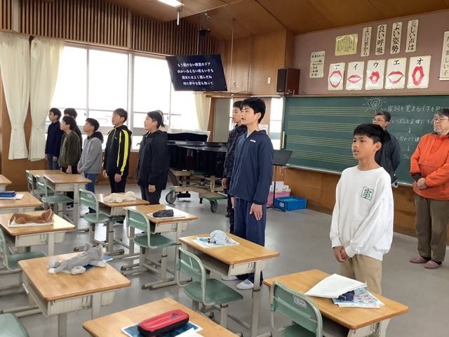 6年1組は卒業式の歌の練習でした。「歌がとても上手で驚きました」と褒めていただきました。