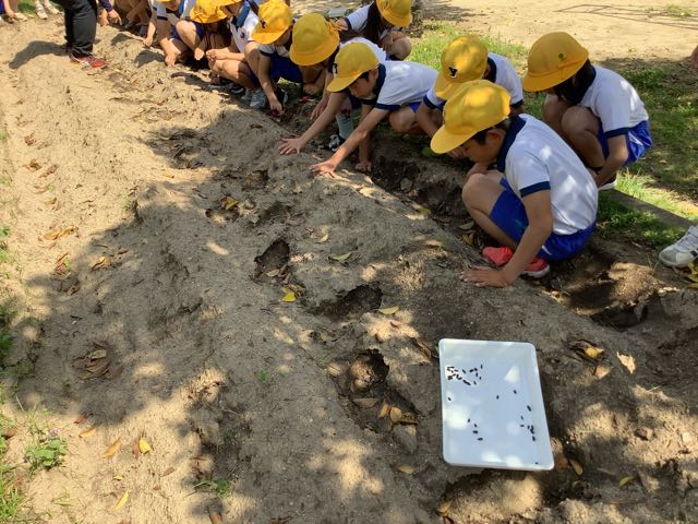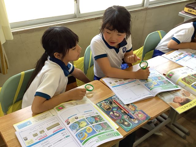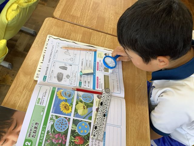 ヒマワリとホウセンカのたねをまくことになりました。先生から2種類のたねをもらい、わくわくする3年生。虫メガネを使って観察しました。