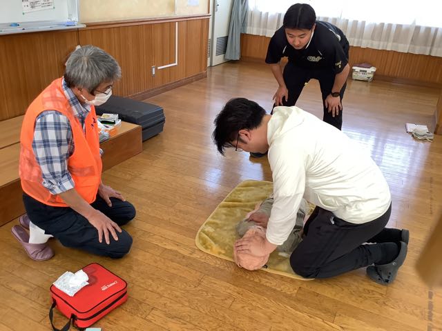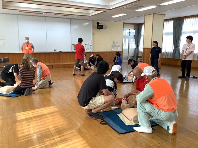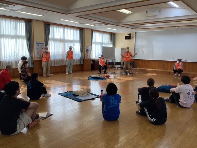 現職教育で子どもたちの命を守るための心肺蘇生法、AEDの使い方等を学びました。専門家を講師にお迎えし、真剣に学びました。