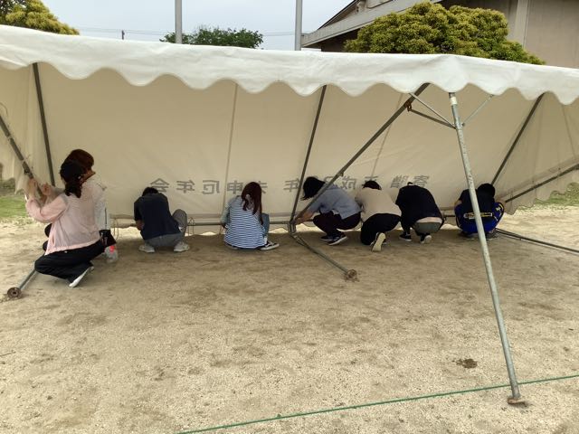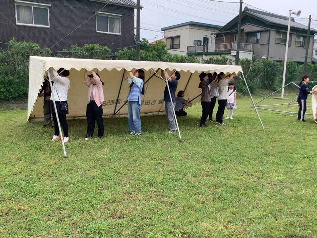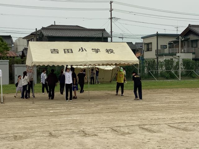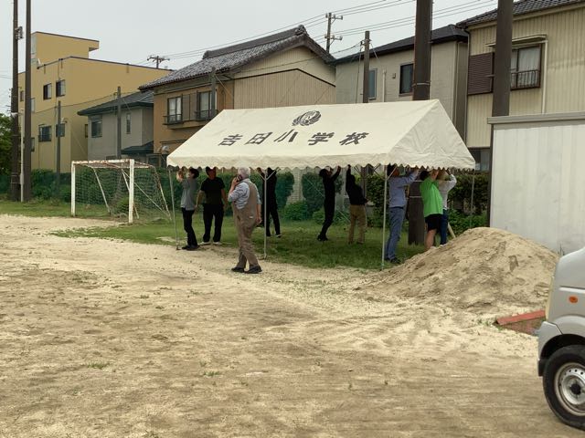 4時からは、吉田小の応援団であるPTAとおやじの会のみなさんがテントを8張り立ててくださいました。このテントで子どもたちを熱中症から守りたいと思います。平日のお忙しい時間にも関わらず、吉田っ子のために力を貸してくださったみなさま、本当にありがとうございました!!
