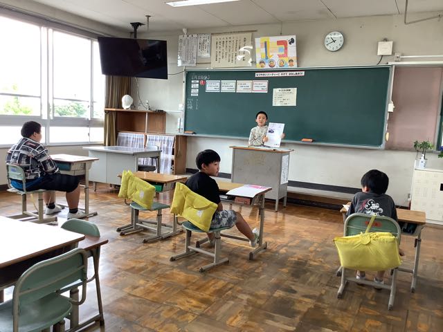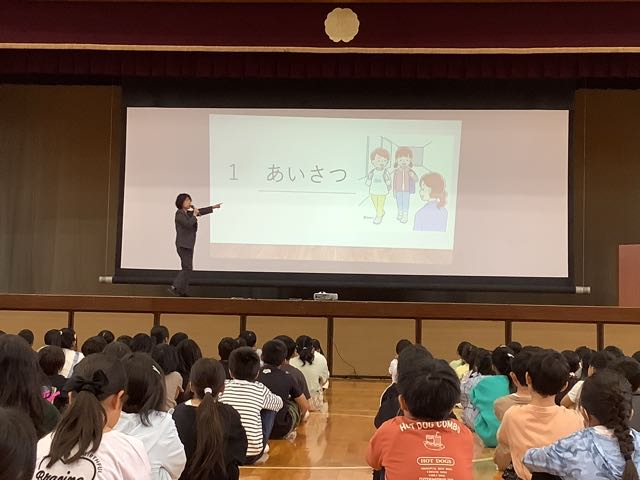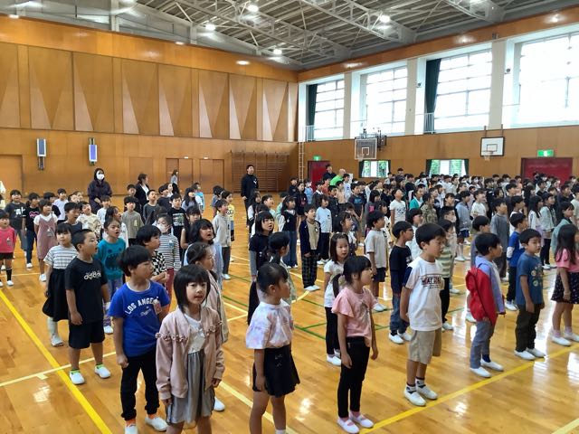 校長先生のお話は、これまでがんばってきたことについてでした。地域の方から、吉田っ子のあいさつがとてもいいと褒めていただいたこと。横断歩道で自転車を降りて渡ったこと、さらに止まってくれた運転手さんに、頭を下げて横断したことについて、ルール、マナーがとてもいいと学校に電話連絡があったこと。みんなの頑張ってる姿を地域の方に認めてもらえてうれしいですね。