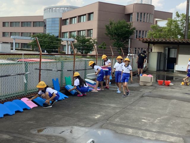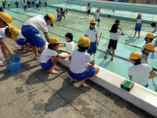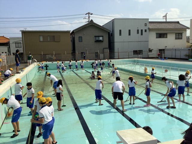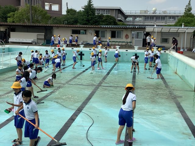 もうすぐプール開きです。5、6年生の力でプールをピカピカにしました。