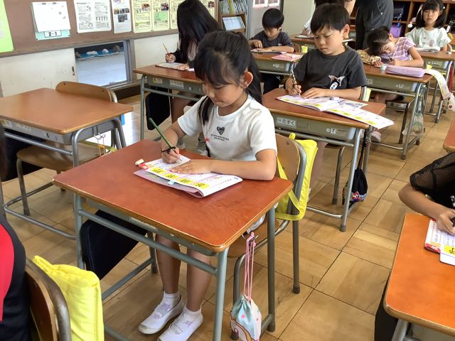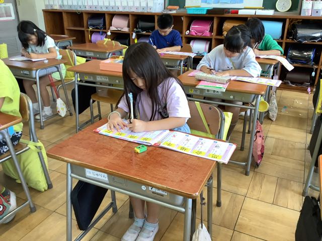 「正しい持ち方で書くときれいに書ける」「100点取れるかもしれない」「きれいな字が書けると自分もみんなもうれしい」「みんなでがんばろう!」姿勢や持ち方を確認して、漢字ドリルに取り組みました。