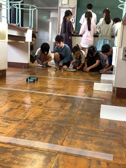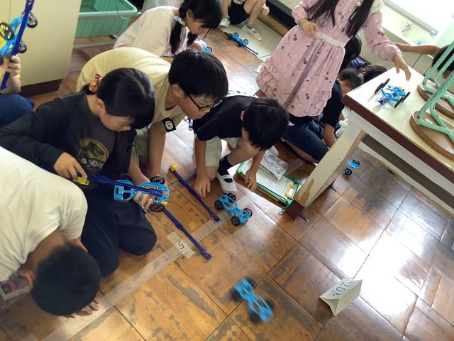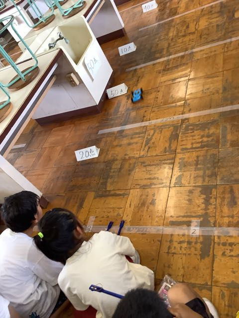 ぴったり賞をめざそう!ゴムの力を使って車を走らせ、合計250点を目指します。一人5回まで挑戦できます。どうしたらぴったりになるのかを考えました。