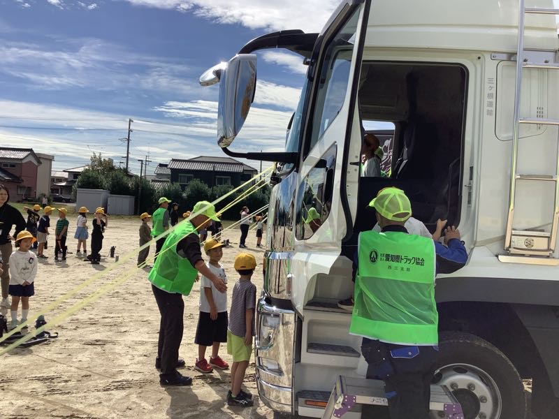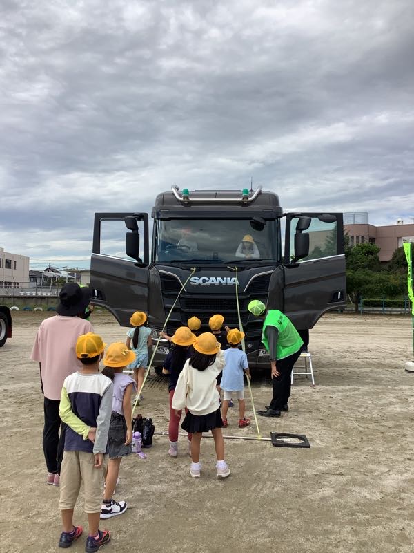 大きなトラックの運転席の視界を体験しました。見えるところ、見えないところがよくわかりました。死角になる場所を学びました。