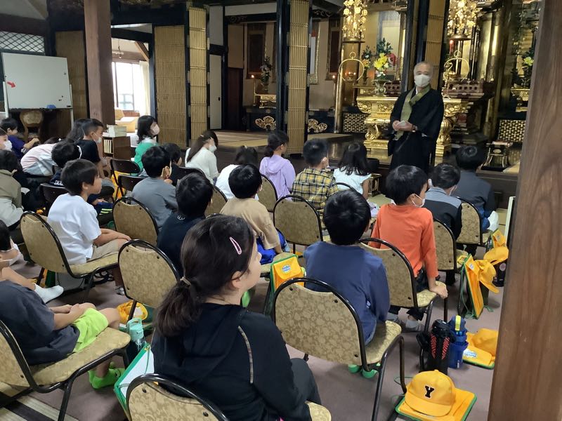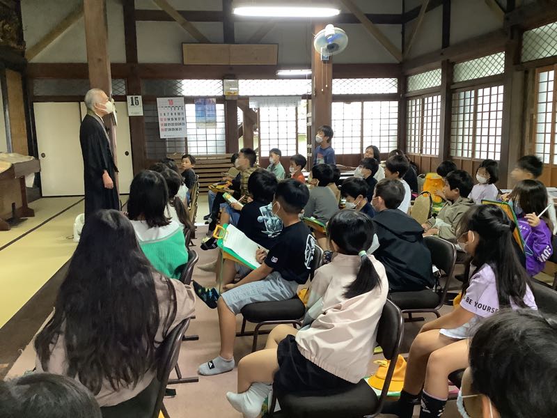 住職の方に、吉田小学校ができる前は正覚寺が小学校のように子どもたちが学ぶ場であったことや、愛知県は全国でお寺が一番多いことなど、たくさんのことを教えていただきました。初めて知ることばかりで、子どもたちは「えぇ。」と驚きの声を上げていました。