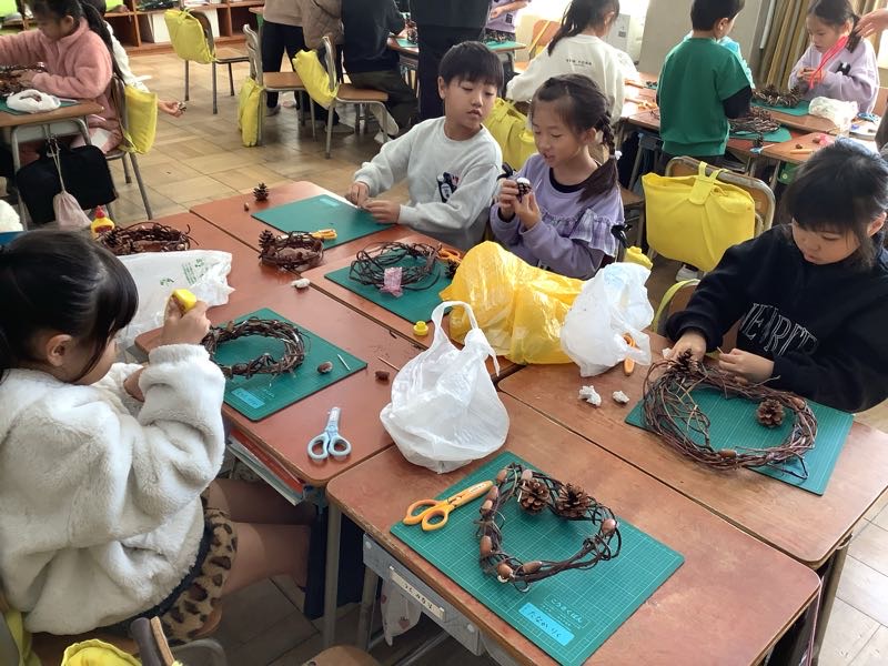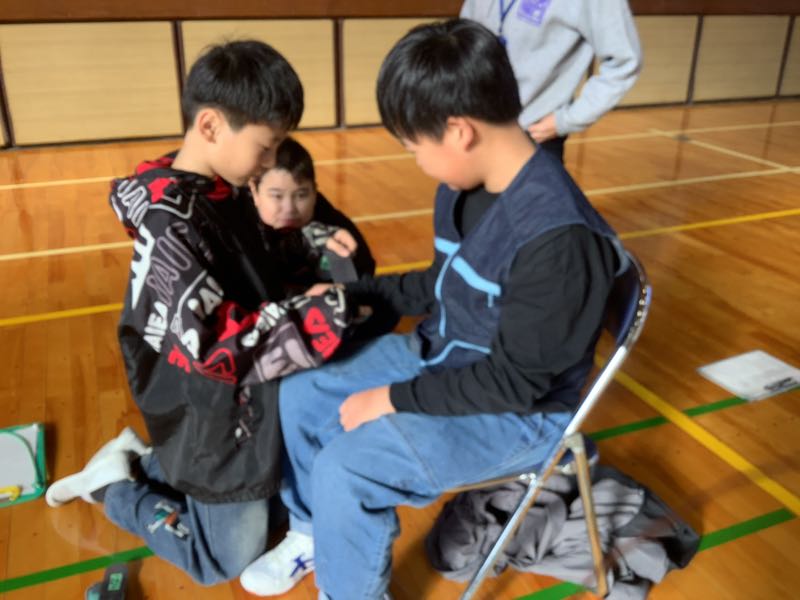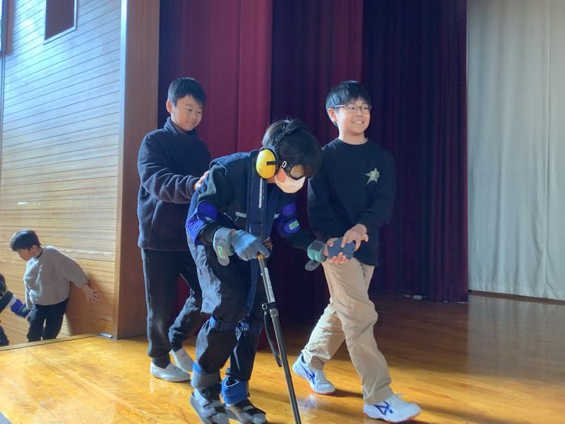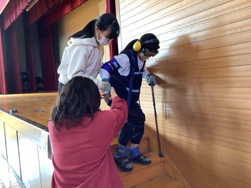 高齢者擬似体験では、足首や手首におもりをつけたり、イヤホンやゴーグルをつけたりして、高齢者になりきって、体験を行いました。階段の上り下りや箸で小さなものをつかんだりなど、いつもは普通にできている動きが難しく感じます。介助者として参加した児童は、「階段危ないよ」「ゆっくりでいいよ」など、優しい声をかけることができていました。