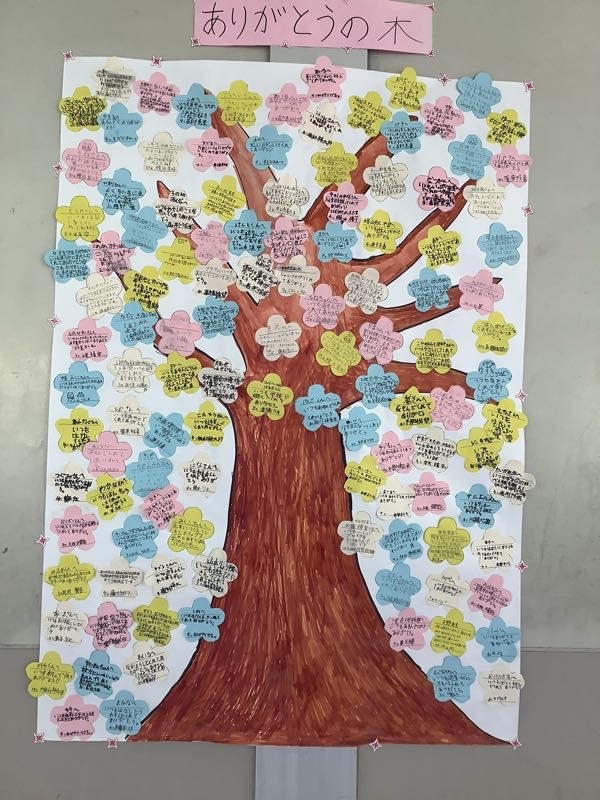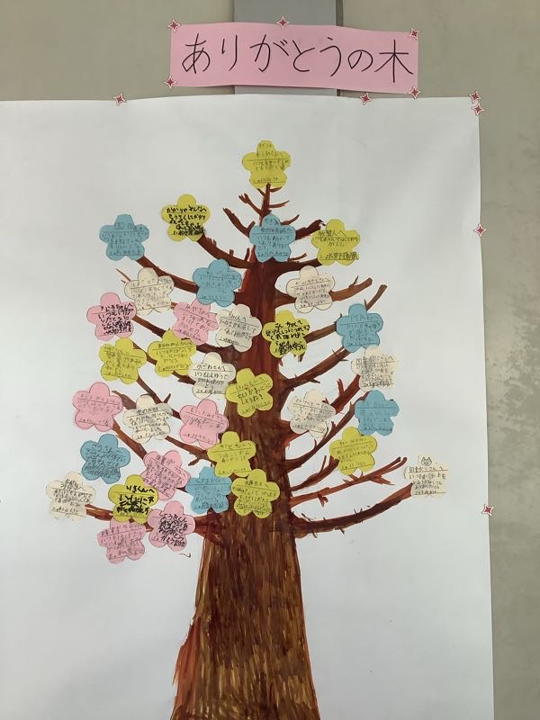 児童会の企画「ありがとうの木」です。友達や先生にありがとうの気持ちを言葉で伝えると、書いた人も書いてもらった人も、そしてそれを読んだ人も「心がホット」になります。