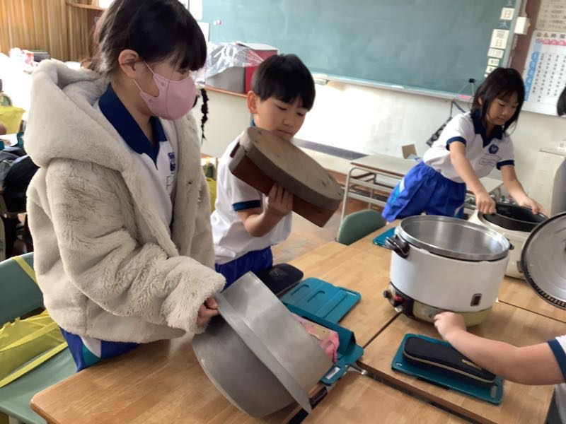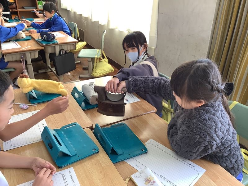 先生が「タイムスリップしてきたよ」と昔の道具を見せると、子どもたちは興味津々!「何これ?どうやって使うの?」「昔のアイロン、すごく重い!」子どもたちがみんなで見て触って、ワクワクしていることが伝わってきました。