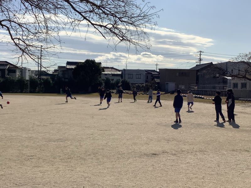 外はすごい風。それでも外でドッジボールや一輪車など友達と仲良く元気に遊んでいました。