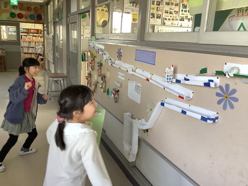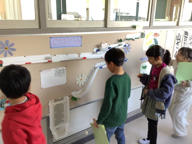 3組の子どもたちが作ったピタゴラスイッチで仲良く遊んでいる子たちもいました。