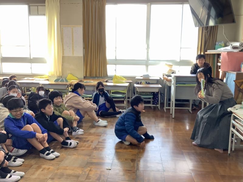 図書ボランティアさんの話を聞き漏らさないように前のめりで聞く子たちが多くいます。