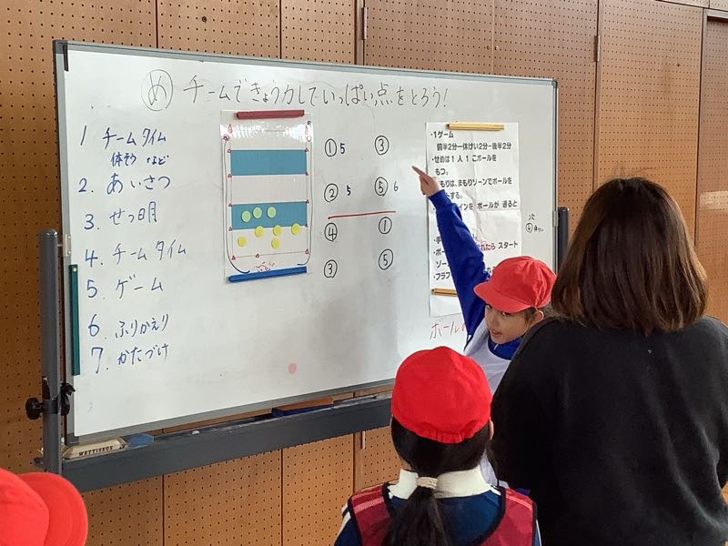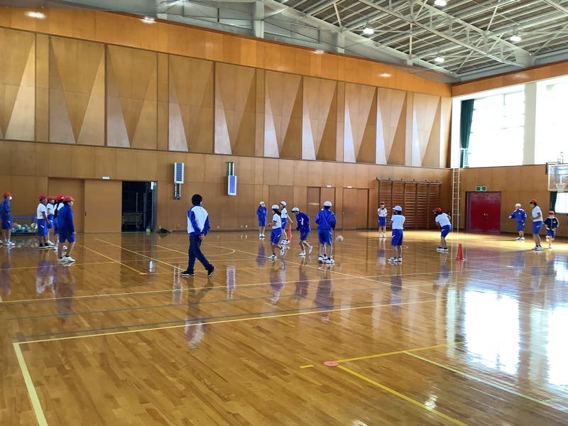 「ゴーゴーゴール」の単元に入りました。チームで協力して点を取ろう、がめあてでした。