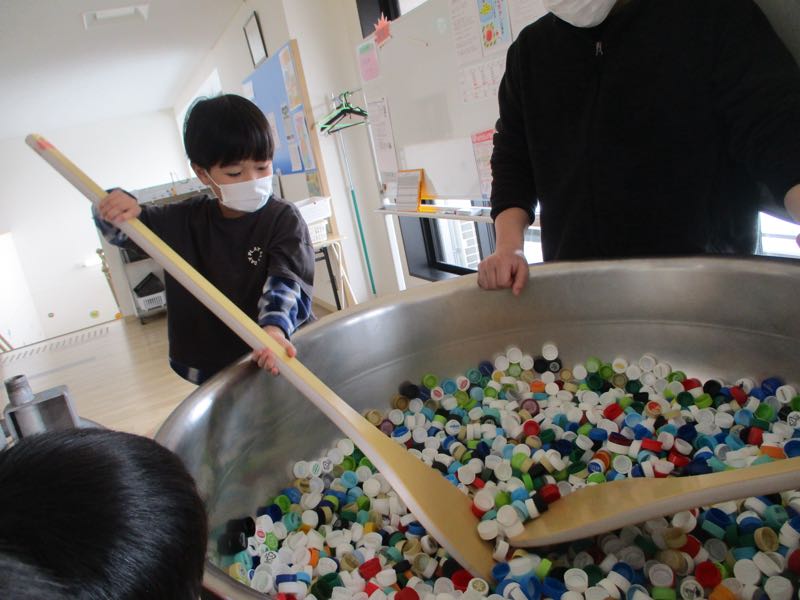 実際に使われているものと同じ大きさのスパテラで混ぜる体験やひしゃくですくう体験をしました。「難しいなぁ」「思ったよりも重たいね!」と言い合う子どもたちの姿がありました。
