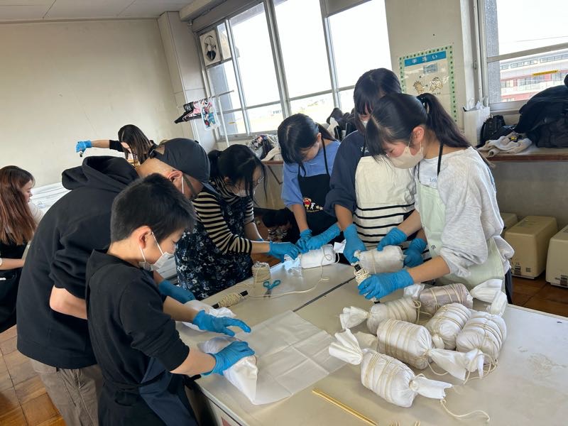 ハム作り2日目です。ハムを布で巻きます。凧糸でぎゅっと縛りました。だんだん上手に巻けるようになりました。