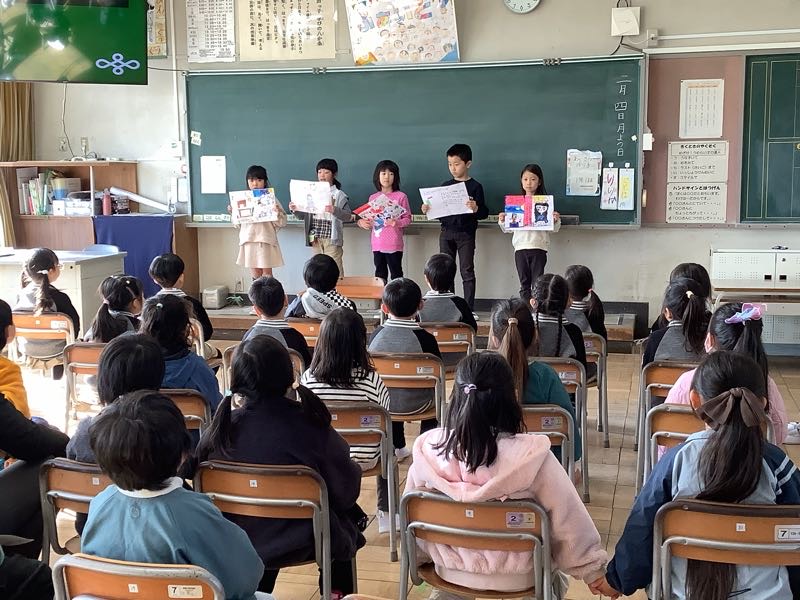 2月3日の全校朝会で作品応募や競書会、マラソン大会の表彰と校長先生のお話を聞きました。