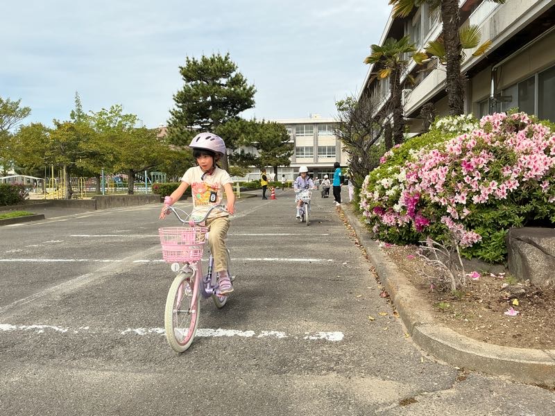 交通指導員の方々、PTA役員・委員の方々に協力をいただき、学校の敷地と周りを使って自転車の安全な乗り方を学びました。